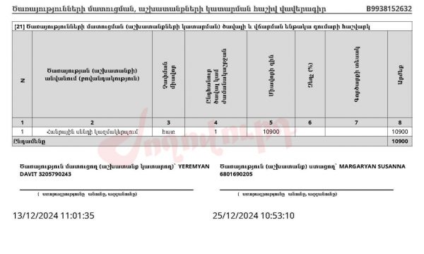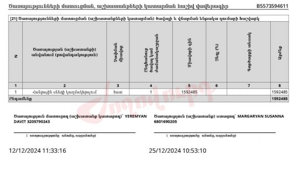 Մեկ այլ փաստաթղթի ուսումնասիրությամբ նկատելի է, որ 2024 թվականի համար «Հայր եւ որդի Երեմյաններ» ՍՊԸ-ի հետ Ազգային ժողովը կնքել է 5 մլն դրամ արժողությամբ պայմանագիր։