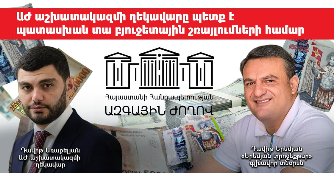 Մինչդեռ, մամուլում «Ձուկ» մականունով հայտնի Դավիթ Առաքելյանը, որը ԱԺ աշխատակազմի ղեկավարն է, այս օրերին բյուջեի հաշվետվությունների ժամանակ արագ կարդում էր թվեր. սակայն նրա գործունեության թափանցիկությունն ու արդյունավետ ծախսերը խիստ հարցական են` դատելով մեր ուսումնասիրած փաստաթղթերի ցանկից: