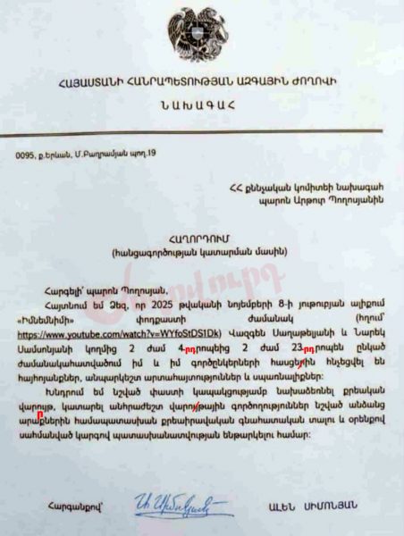 Ի դեպ, իրավապահներից նա ջերմ հարաբերություններ ունի միայն Արթուր Պողոսյանի հետ, դրա համար էլ նրա անունով է հաղորդումը ներկայացրել, այլ ոչ թե ՀՀ գլխավոր դատախազի»։