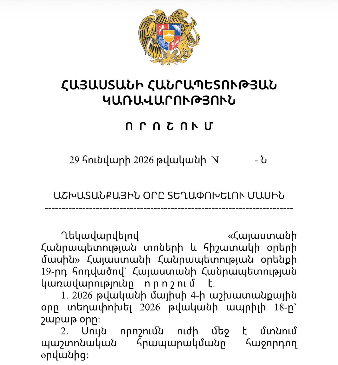 Ըստ որոշման հիմնավորման՝ գագաթաժողովին մասնակցելու են մոտ 50 բարձրաստիճան պատվիրակության` երկրի կամ կառույցի ղեկավարի մակարդակով և Երևանում տրանսպորտային երթևեկությունն արդյունավետ կազմակերպելու համար անհրաժեշտություն է դարձել մայիսի 4-ի աշխատանքային օրը տեղափոխել։ Որոշման նախագծում չի նշվում, թե նշված օրը ոչ աշխատանքային դարձնելու հետևանքով որ օրը կդառնա աշխատանքային։