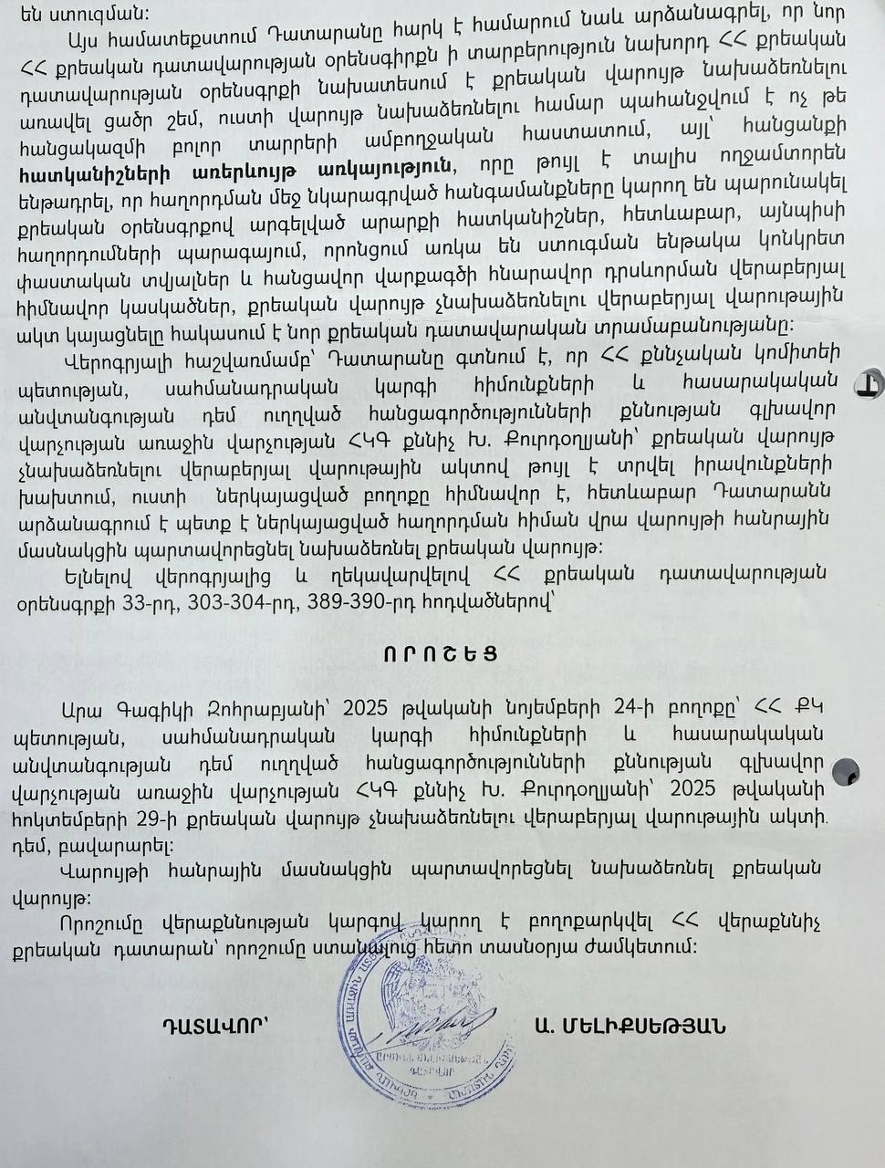 Ինչպես և սպասվում էր, 29.10.2025թ․ Քննչական կոմիտեն մերժել է քրեական վարույթ նախաձեռնելը, իսկ դրա դեմ բերված բողոքը 18.11.2025թ․ իր հերթին մերժել էր ՀՀ գլխավոր դատախազությունը: