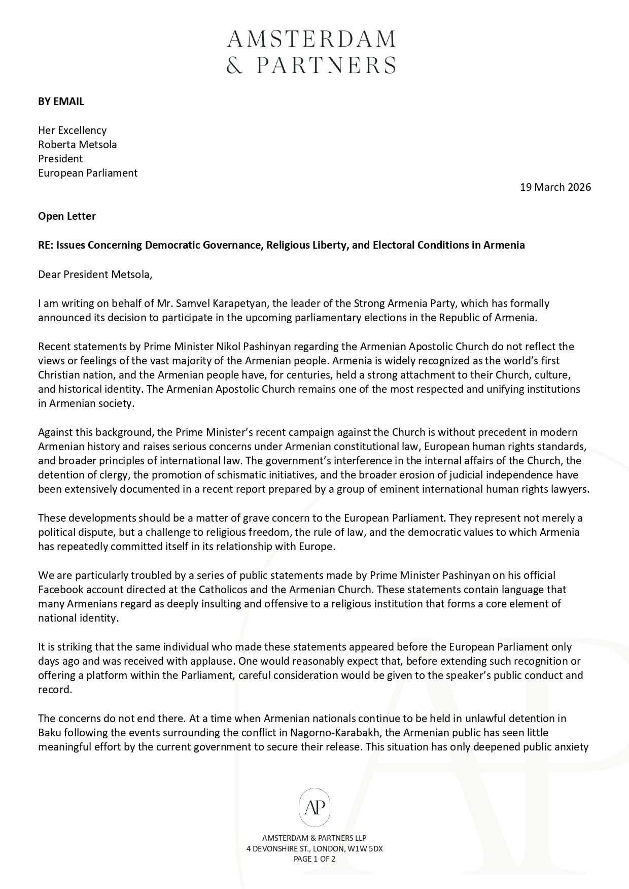 Միջազգային իրավաբան, Amsterdam & Partners LLP-ի հիմնադիր Ռոբերտ Ամստերդամը ներկայացրել է իր բաց նամակը՝ ուղղված Եվրոպական Խորհրդարանի նախագահ Ռոբերտա Մեցոլային․