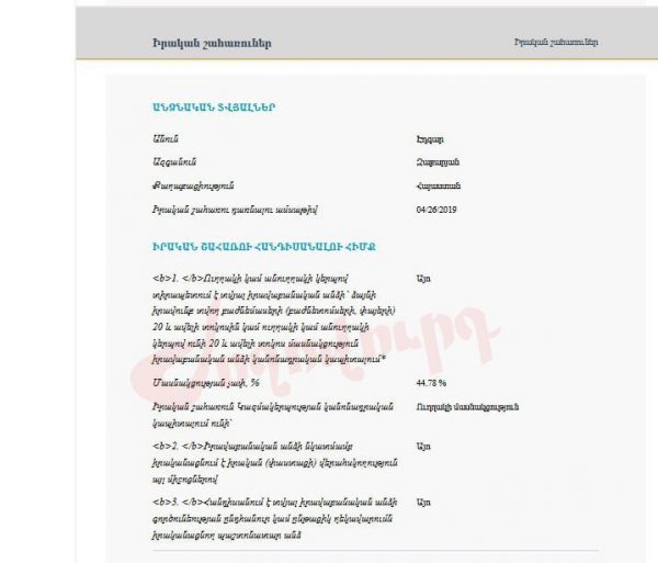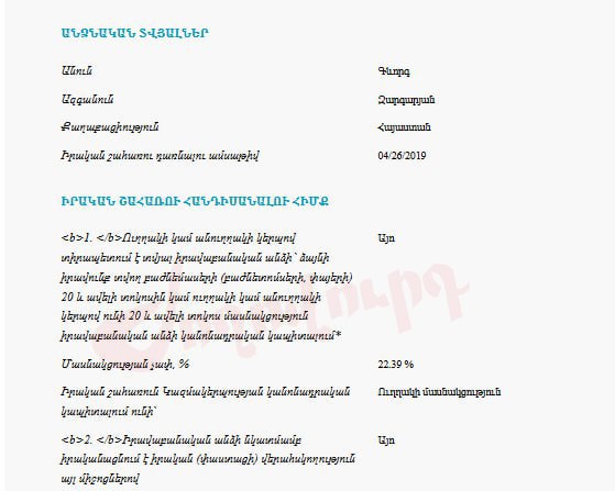Փաստեմ նաեւ, որ օրենքով անթույլատրելի որեւէ գործողություն չի արվել իմ եւ այն ընկերության կողմից, որի տնօրենը ժամանակին հանդիսացել եմ ես։