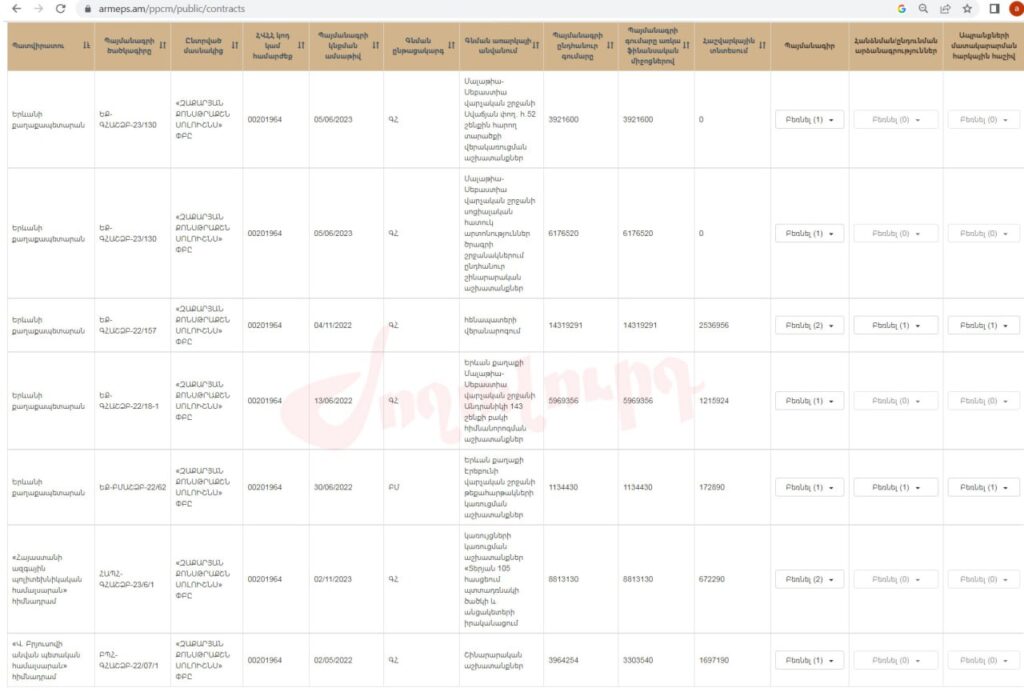 Իսկ, ահա, 13․06․2022-ից մինչեւ 05․06․2023-ը կնքվել է 5 պայմանագիր Երեւանի քաղաքապետարանի հետ.