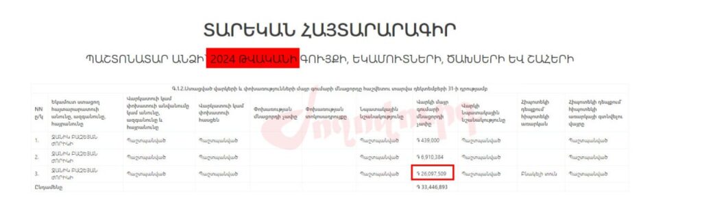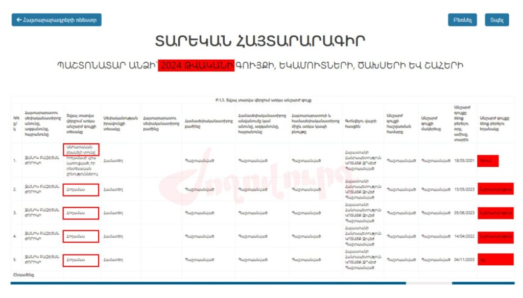 Հաջորդ տարվա՝ 2024 թվականի հայտարարագրում գույքերը դարձել են 5-ը։
