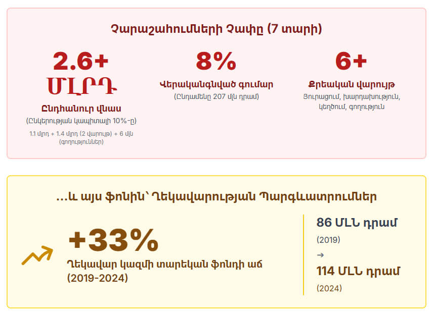 Այս ընթացքում ԲԷՑ-ի ղեկավար կազմի աշխատավարձերի ու պարգևատրումների տարեկան ֆոնդը գնալով աճել է։ Եթե 2019-ին այս ֆոնդը տարեկան կազմում էր մոտ 86 մլն դրամ, 2024-ին այն հասել է 114 մլն դրամի (աճը կազմել է մոտ 33 տոկոս)։