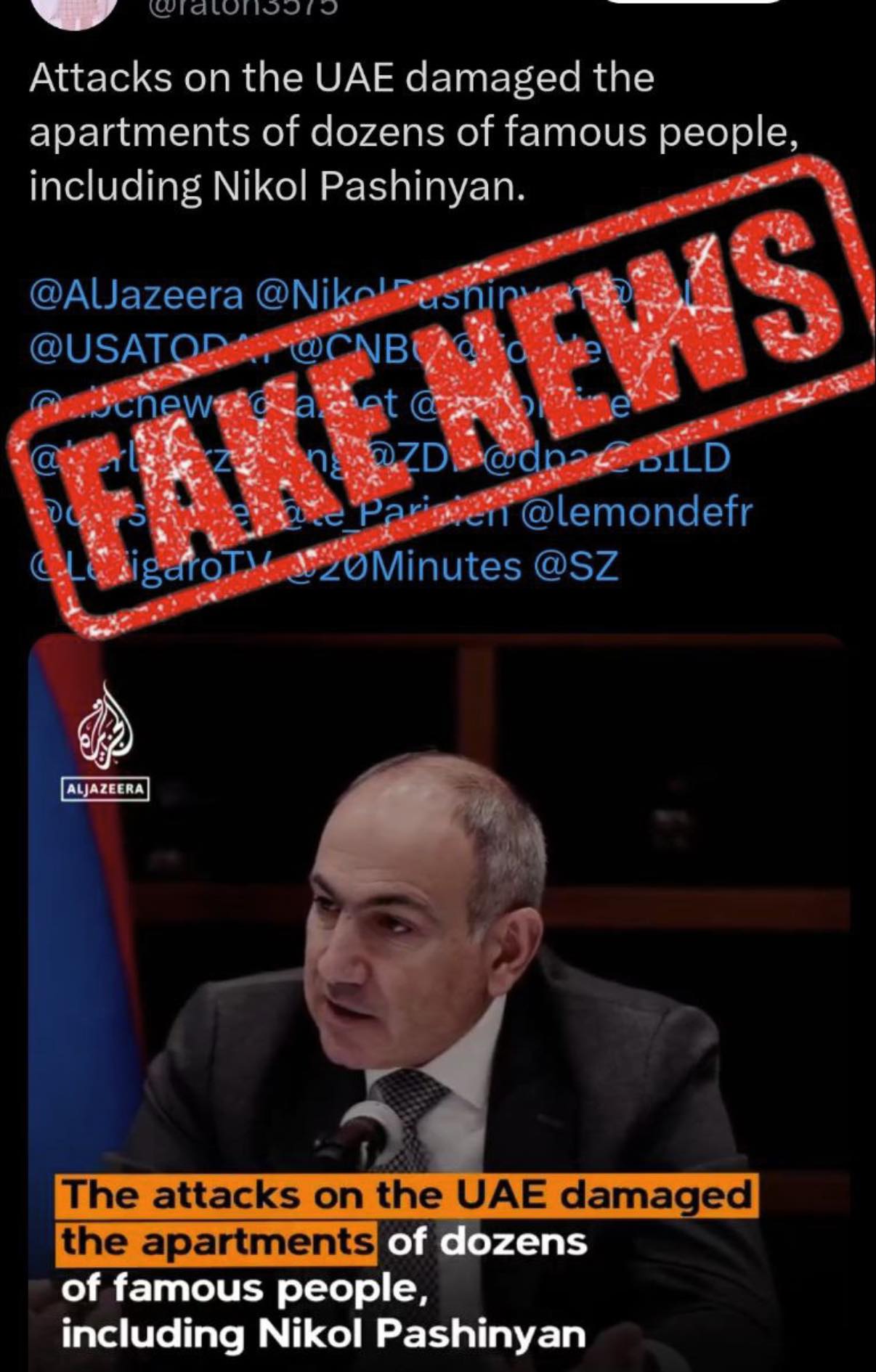 «Նախորդող օրերի ընթացքում X հարթակում կասկածելի օգտատերերի կողմից տարածվում են տեսանյութեր, որոնք իբրև թե հղում են անում «Al Jazeera»-ին և «Euronews»-ին՝ պնդելով, թե ԱՄԷ-ում՝ Դուբայում հրթիռակոծության հետևանքով վնասվել է ՀՀ վարչապետ Նիկոլ Փաշինյանին պատկանող անշարժ գույքը։