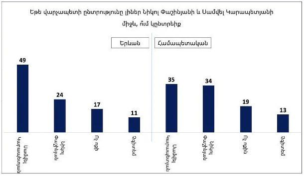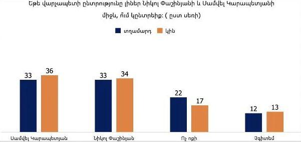 Վարչապետի թեկնածուների համեմատությունում Սամվել Կարապետյանը Նիկոլ Փաշինյանի նկատմամբ 18%-ով առավելություն ունի 18–29 տարեկան երիտասարդների շրջանում, 4%-ով ՝ 30–49 տարեկանների շրջանում, մինչդեռ Նիկոլ Փաշինյանն առաջատար է միայն 50-ից բարձր ընտրողների խմբում։ Տղամարդկանց շրջանում նրանց աջակցությունը հավասար է, իսկ կանանց շրջանում Սամվել Կարապետյանը առաջ է 2%-ով։
