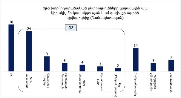 Վարչապետի պաշտոնին համապատասխանության վերաբերյալ տվյալները արտացոլվում են նաև խորհրդարանական քվեարկության պատկերում, որտեղ «Քաղաքացիական պայմանագիր» կուսակցությունը ստանում է ընդամենը 28%, մինչդեռ ընդդիմադիր ուժերը միասին ունեն 47%։ Այս արդյունքներով Սամվել Կարապետյանը համարվում է վարչապետ դառնալու առաջատար թեկնածուն՝ որպես ընդդիմության առաջատար կուսակցության նախագահ: