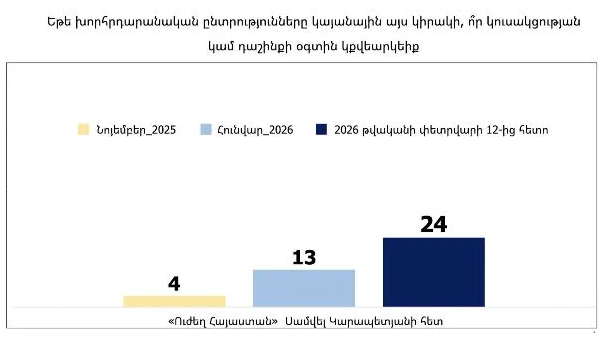Նիկոլ Փաշինյանը կայուն կերպով կորցրել և կորցնում է ընտրողների աջակցությունը։ Հանրային վստահության անկմանը նպաստել են խոստումների չիրականացումը, անվտանգային խնդիրների նկատմամբ անլուրջ վերաբերմունքը, խմելու ջրի մատակարարման հետ կապված խնդիրները, գների աճը եւ պատերազմի սպառնալիքի խորացումը։ Հիասթափված ընտրողների մեծ մասը ապավինել է Սամվել Կարապետյանի գլխավորած նոր կուսակցությանը։ Կուսակցության աջակցությունը վերջին ամիսներին զգալիորեն աճել է․ այն 2025 թվականի նոյեմբերից մինչև 2026 թվականի հունվարն աճել է՝ 4%-ից հասնելով 13%-ի։ «Ուժեղ Հայաստան» կուսակցության մեկնարկը լրացուցիչ զգալի խթան է տվել այդ աճին, և քվեարկության մտադրության ցուցանիշը հասել է 24%-ի։