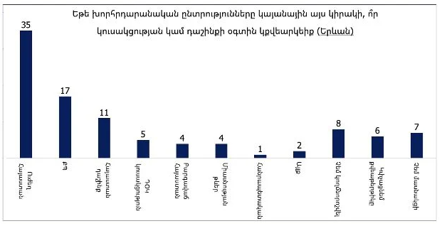 Երևանում «Ուժեղ Հայաստան» կուսակցության աջակցությունն էլ ավելի բարձր է՝ գրեթե կրկնակի գերազանցելով «Քաղաքացիական պայմանագրին»։ Եթե խորհրդարանական ընտրությունները կայանային հիմա, ապա Երևանում ընտրողների 35%-ը կքվեարկեր «Ուժեղ Հայաստանի» օգտին, մինչդեռ «Քաղաքացիական պայմանագիրը» կստանար միայն 17%։ «Հայաստան» դաշինքը կհավաքեր 11%, իսկ մնացած ընդդիմադիր ուժերը՝ 16%։ Բացի այդ, քանի որ չկողմորոշված ընտրողների բաժինը կազմում է ընդամենը 8%, այլևս բավարար թվով ընտրողներ չեն մնացել, որոնց Նիկոլ Փաշինյանն ու «Քաղաքացիական պայմանագիրը» կարող են իրենց կողմ գրավել։ Սա նշանակում է, որ Երևանում Փաշինյանն արդեն պարտվել է ընտրությունները։
