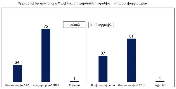 Մարդիկ կորցնում են վստահությունը Նիկոլ Փաշինյանի նկատմամբ թե՛ Երևանում, թե՛ ամբողջ Հայաստանում։ Երեւանում միայն 24%-ն է գոհ վարչապետի պաշտոնում նրա կատարած աշխատանքից, մինչդեռ 75%-ը դժգոհ է։ Համապետական մակարդակով եւս իրավիճակը Փաշինյանի համար բարենպաստ չէ․ 37%-ը գոհ է նրա աշխատանքից, իսկ 61%-ը՝ դժգոհ։