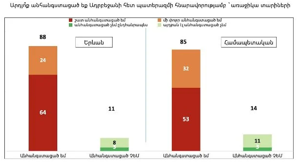 Մարդիկ կորցնում են վստահությունը Նիկոլ Փաշինյանի նկատմամբ, քանի որ վախենում են պատերազմի վերսկսումից եւ կարծում են, որ նրա հաստատած խաղաղությունը միայն ժամանակավոր է։ Նրանք գիտակցում են, որ Նիկոլ Փաշինյանի նման թույլ վարչապետի պայմաններում խաղաղությունը պարզապես երազանք է, եւ պատերազմը կարող է ցանկացած պահի նորից սկսվել, ինչպես դա եղավ 2020 թվականին՝ նրա կառավարման ընթացքում։ Երևանում հարցվածների 64%-ը նշել է, որ Ադրբեջանի կողմից պատերազմի վերսկսման հնարավորությունից «շատ անհանգստացած» է, եւս 24%-ը՝ «որոշ չափով անհանգստացած»։ Միայն 11%-ն է նշել, որ «այնքան էլ անհանգստացած չէ» կամ «ընդհանրապես անհանգստացած չէ»։ Համապետական մակարդակով եւս պատերազմի վախը շատ բարձր է․ 53%-ը «շատ անհանգստացած» է, 32%-ը՝ «որոշ չափով անհանգստացած», եւ միայն 14%-ն է «այնքան էլ անհանգստացած չէ» կամ «ընդհանրապես անհանգստացած չէ»։