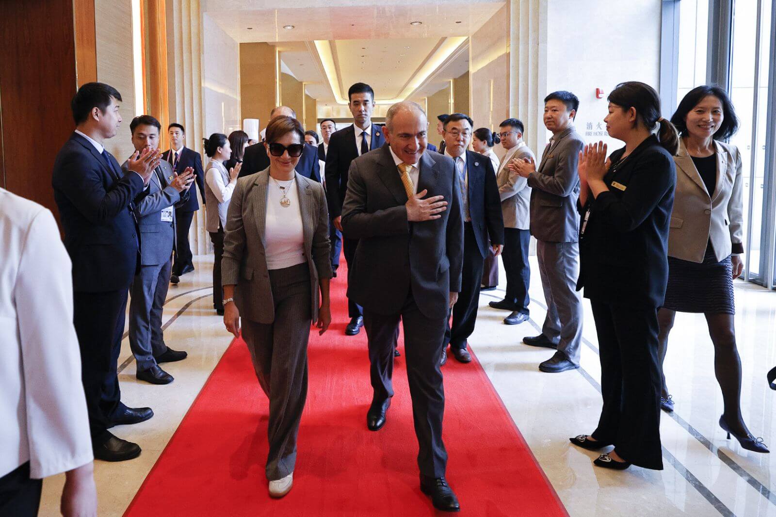 Վարչապետին և տիկնոջը Թիենծինից ճանապարհել է փոխքաղաքապետ Վան Սյուֆենգը, իսկ Պեկինում ՀՀ կառավարական պատվիրակությանը դիմավորել է Պեկինի Ազգային քաղաքական խորհրդակցական խորհրդի փոխնախագահ Յան Ինը: