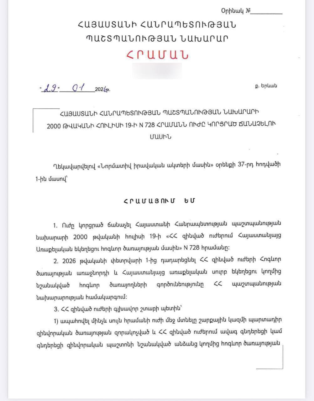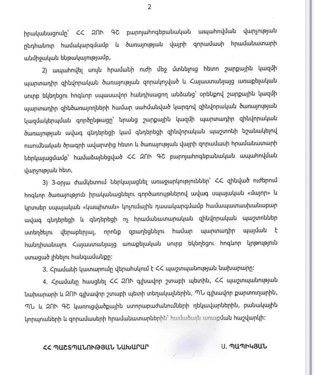 Սուրեն Պապիկյանը հրապարակել է Զինված ուժերում հոգևոր առաջնորդության լուծարման մասին հրամանը։ Պաշտպանության նախարարն ընդգծել է, որ որոշման հրապարակման նպատակը տարընթերցումներից խուսափելն է։