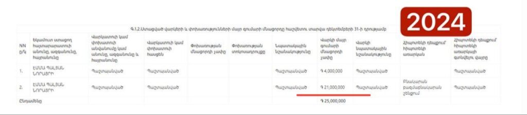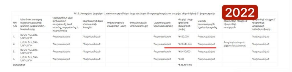 Էմմա Պալյանի ստացած վարկերի եւ փոխառությունների մայր գումարի մնացորդը հաշվետու տարվա դեկտեմբերի 31-ի դրությամբ կազմել է 25 մլն դրամ, որից 21 մլն դրամը բնակարանի հիփոթեքի մայր գումարի մնացորդն է, սակայն հետաքրքիրն այն է, որ Պալյանի հիփոթեքի մայր գումարի մնացորդը վերջին 2 տարիներին փոփոխության չի ենթարկվել։ Այսինքն, ըստ փաստաթղթի՝ պատգամավորը վարկը չի մարել: Ավելին, եթե այն համեմատենք, կնկատենք, որ նվազման փոխարեն հիփոթեքային վարկը աճել է. այն 2022-ին կազմել է 20 մլն 643 հազար դրամ։