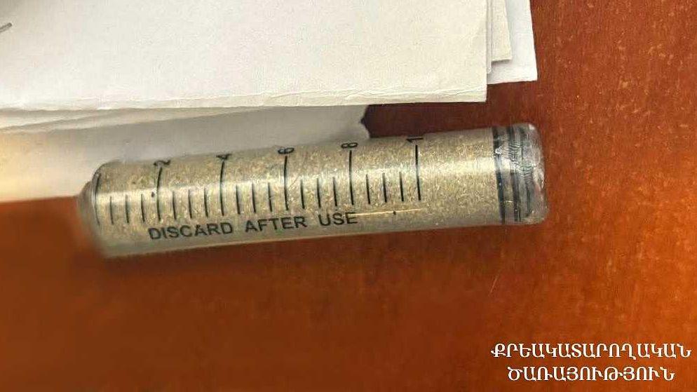 Խուզարկության արդյունքում փաստաբանի պայուսակից՝ փաստաթղթերի տակից, հայտնաբերվել է 10 մլ տարողությամբ, սպիտակ, թափանցիկ ներարկիչ՝ առանց հետնամասի, երկկողմանի հալեցված վիճակում։ Ներարկիչի մեջ առկա է եղել 8.44 գրամ քաշով, թմրամիջոցի նմանվող, մուգ շագանակագույն, փոշենման զանգված: