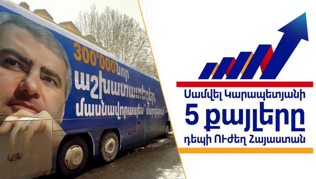 Այսօր տրվել է արշավի մեկնարկը։ Սամվել Կարապետյանի գլխավորած ուժի ներկայացուցիչները մեծ ավտոբուսով շրջելու են Հայաստանով ու ներկայցնեն տնտեսական փոփոխությունների ծրագիրը։ Ավտոբուսի վրա պատկերված են Սամվել Կարապետյանի լուսանկարն ու տնտեսական ծրագրի կետերը։ Դրանցից առաջինը 300 հազար նոր աշխատատեղերի ստեղծումն է` հատկապես մարզերում։