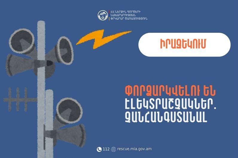 Մարտի 16-ին՝ ժամը 10:00-ին, Սյունիքի մարզի Սիսիան քաղաքում կանցկացվի էլեկտրական շչակների փորձարկում։ Այդ մասին տեղեկացնում են ՀՀ ներքին գործերի նախարարության փրկարար ծառայությունից։