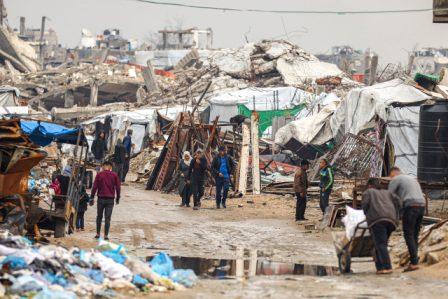 GAZA CITY, GAZA - JANUARY 18: Displaced Palestinian families living in the Jabalia area continue their daily lives under harsh conditions amid the rubble left by Israeli attacks, in Gaza City, Gaza, on January 18, 2026. Lacking basic necessities, families shelter in makeshift tents set up near their destroyed homes as they struggle to cope with cold weather. Khames Alrefi / AnadoluNo Use USA No use UK No use Canada No use France No use Japan No use Italy No use Australia No use Spain No use Belgium No use Korea No use South Africa No use Hong Kong No use New Zealand No use Turkey