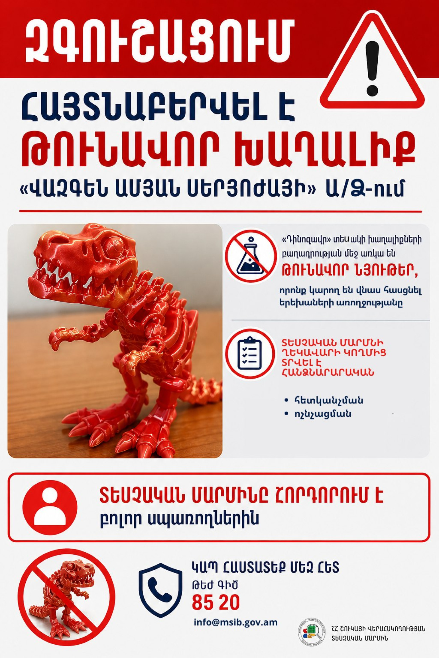 Իրականացվել է խաղալիքի նմուշառում, որի արդյունքում պարզվել է, որ «Դինոզավր» անվանմամբ վաճառվող խաղալիքի բաղադրության մեջ առկա են երեխաների առողջության համար վտանգավոր (թունավոր) նյութեր։